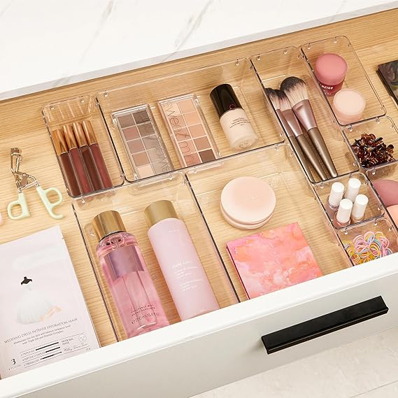 ✔Make Everything Organized -- These clear versatile drawer dividers trays are perfect for any place in your home. Fit all kinds of drawers, such as vanity / bathroom / kitchen / office drawers/ craft room, ideal for organizing cosmetics, makeup tools, hair accessories, jewelry, pins, office supply, craft supplies, utensils, etc.