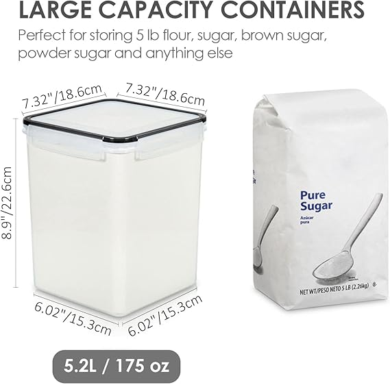 Perfect for Storing Dry Food ---- The size of each container is 7.5 x 7.5 x 9.1 inch ( 5.2L / 175 oz) , with the large capacity, these kitchen storage containers are perfect for many kinds of dry food and baking supplies, such as flour, sugar, rice, grain, chips, cereals, nuts, beans, snacks, pasta, coffee and tea. Plus wide enough openings to reach in with measuring cup.