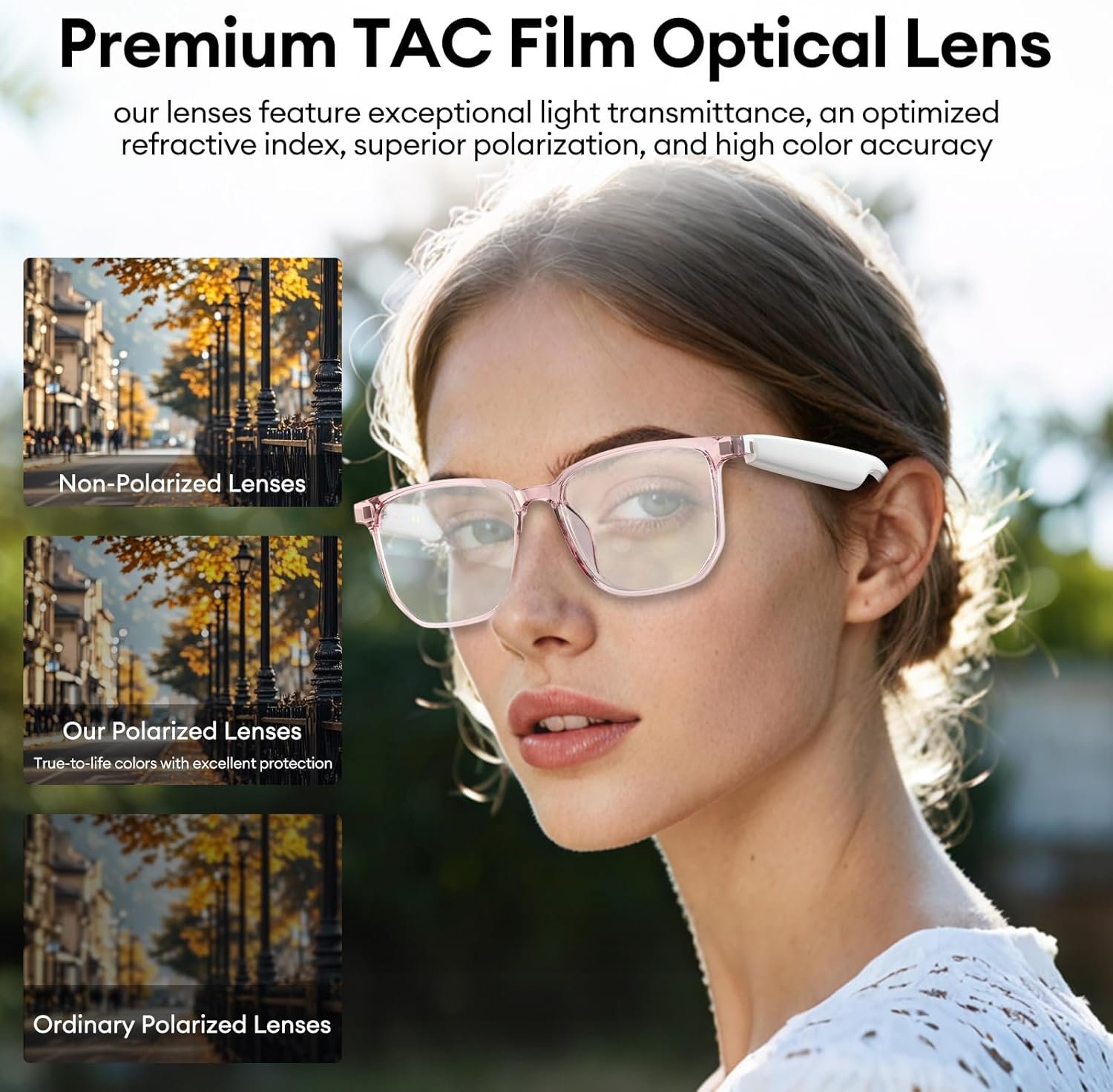 Featuring blue light filtering lenses, these glasses help reduce eye strain during long hours of use whether you’re outdoors or working on screens. The open‑ear audio design keeps you aware of your surroundings while delivering clear sound for music and calls. Lightweight and comfortable to wear, they are ideal for users who want both fashion and functionality in a smart wearable.