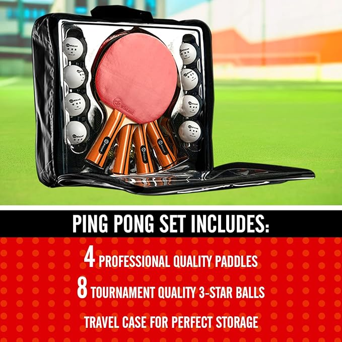 • BEGINNER OR EXPERT PLAYER THIS SET IS FOR YOU - The Premium Quality Bundle Includes 4 Table Tennis Racquets, 8 Ping Pong Balls, And A Convenient Portable Case So That You Can Keep Your Gear Organized Or For Easy Travel.