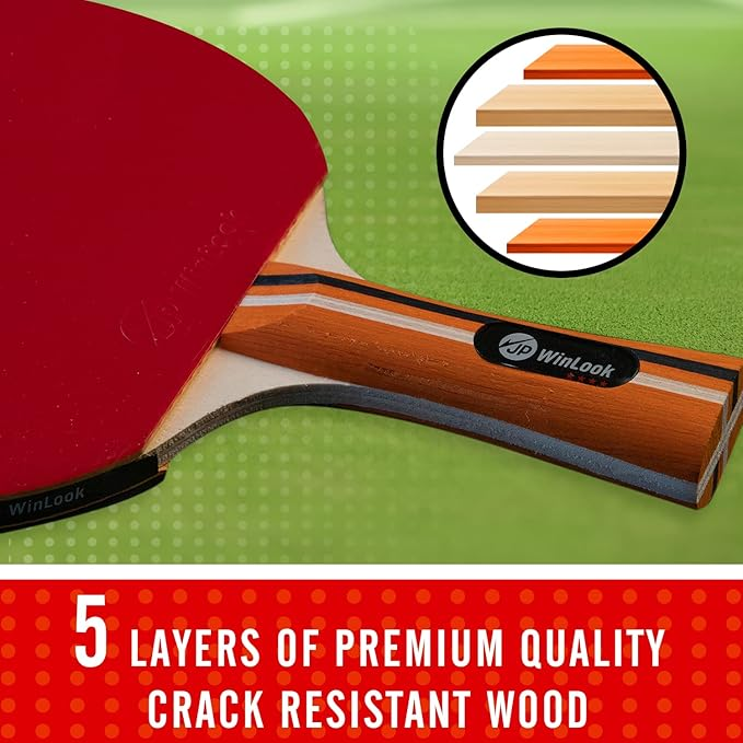 • PREMIUM QUALITY MATERIALS - Our Ping Pong Paddles Are Made Of High-Quality Crack Resistant Wood That Consists Of 5 Layers For More Durability. A Flared Ergonomic Handle That Provides Comfort And Control. And A Medium Soft Bounce Sponge For Feel And Spin That Will Take Your Game To The Next Level.