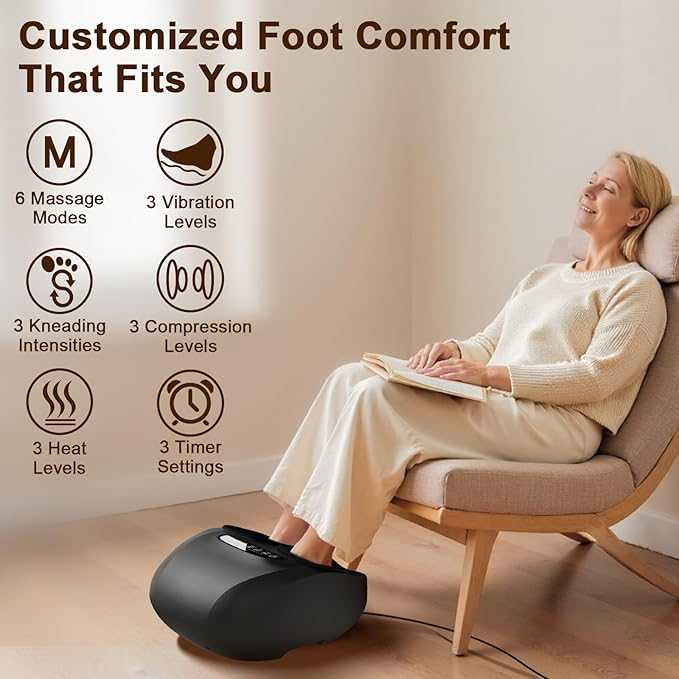 • 【6 Preset Modes, Custom Control, Just for You】This shiatsu foot massager with heat features 6 preset massage modes that combine kneading, compression, vibration, and heat in unique rhythms to enhance daily foot relaxation. Since everyone has different preferences—some enjoy deeper kneading, others prefer gentler warmth or quicker pulses—the device includes 3 kneading speeds, 3 compression levels, 3 vibration intensities, and 3 heat settings. This flexibility allows you to personalize your massage for a more enjoyable daily routine.