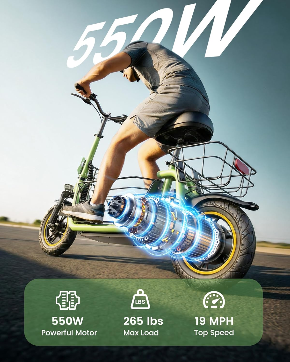 【SMOOTH & POWERFUL RIDE】Equipped with a 550W motor and 36V 10.4Ah battery, this adult electric scooter reaches speeds up to 19 MPH (3 speed modes) and travels up to 25 miles on a single charge. Perfect for commuting, errands, or fun rides.