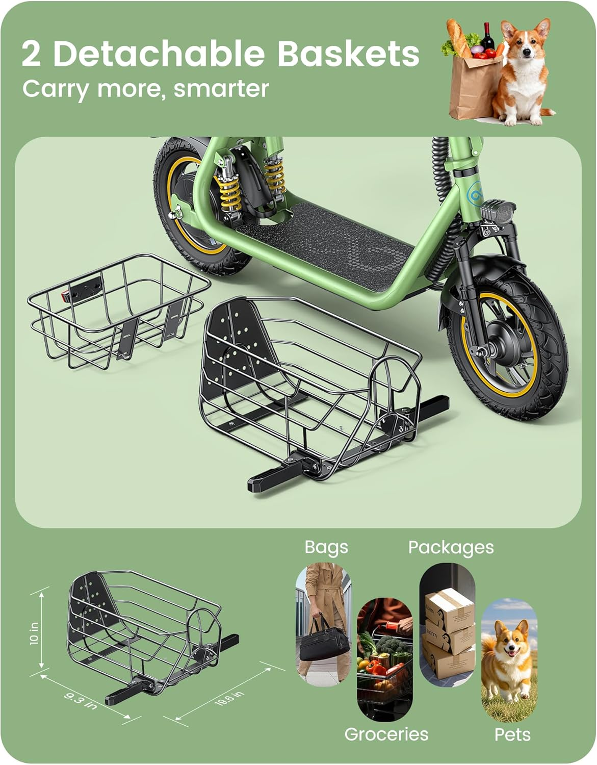 【SMART DESIGN & CONVENIENCE】Includes a large removable front basket and a rear basket for ample storage. The LED display shows speed, battery level, and mode. Integrated headlight and taillight ensure visibility. One-step folding allows for easy storage and transport.